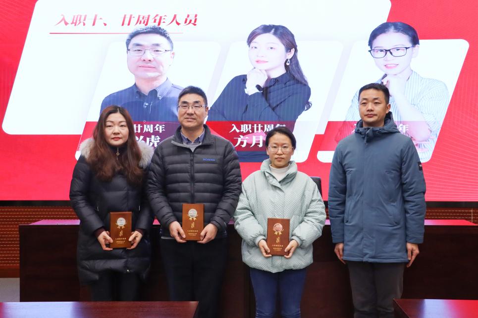 随后张焱分别为入职20周年教职工王兴虎、方月娥以及入职10周年教职工尹培培颁发了纪念奖杯,并合影留念。王兴虎、尹培培作为教职工代表发表了感言。王兴虎表示,非常感谢处领导和同事多年来的培养与支持,希望与全体教职工一道继续保持对信息化工作的热爱,不断加强学习,牢记使命担当,共同为学校信息化发展贡献力量。尹培培首先感谢单位的教育和培养,并表示,将以此次岗位聘任为契机,加强学习,不断努力,弥补短板,发挥特长,尽心尽力做好工作。