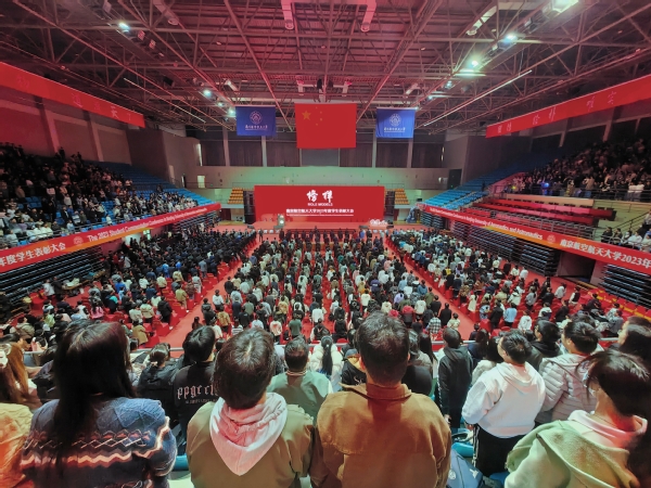 最后,所有与会人员齐唱校歌,我校2023年度学生表彰大会在恢宏的校歌中落下帷幕。近万名学生在天目湖校区分会场、宿舍、工作室收看了网络直播。