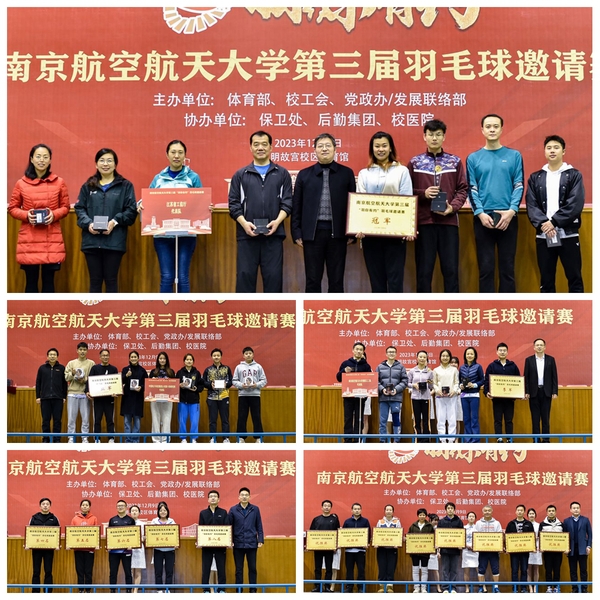 正式比赛以混合团体形式开展,包含男子双打、女子双打和混合双打,共分为小组赛和排位赛两个阶段,经过一整天精彩角逐,各项赛程圆满完成。最终,江苏省工信厅代表队夺得团体冠军,中国电科集团公司第十四研究所代表队获得团体亚军,南京航空航天大学二队获得团体季军,六合区政府代表队、南京校友会代表队、中国移动南京分公司代表队、南京航空航天大学一队、航发南京轻型航空动力公司代表队分获第四至第八名,上海校友会代表队等8支队伍获得优胜奖。