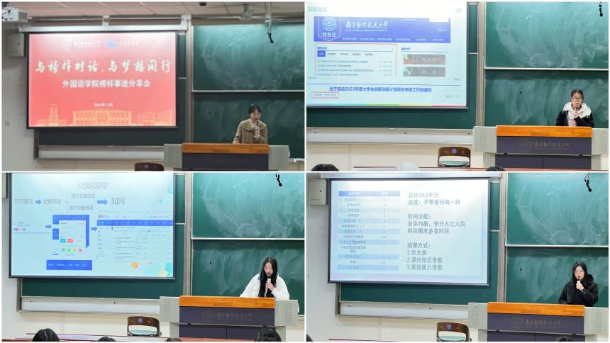 接下来,2021级日语专业的王雅琪从创新项目的前期准备、立项书的填写以及前期工作进展三个方面向同学们分享了宝贵的经验,并结合具体范例进行展示;2022级英语专业的朱丹作以时间为切入点,向同学们介绍了项目的每一个重要节点,从准备的选题方法、组队方式、申报表的各项内容,到初期答辩、中期检查、结项验收,全程介绍了一个完备过程;2021级本科生徐姝作为2022-2023学年国家奖学金获得者,分享了自己的学习经验,她介绍了不同课程的考试内容和相对应的准备方法,结合自身经历分享不同学年的学业目标,并鼓励同学多加锻炼,积极参与学科相关的竞赛和考级考证。