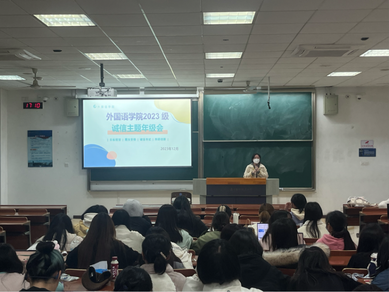 为进一步加强考风考纪教育,增强同学们的诚信意识,并帮助同学们更好迎接即将到来的期末考试,12月7日下午,外国语学院2023级诚信主题年级会暨“榜样 对话”分享会在D3102举行。年级会由本科生辅导员彭欢、兼职辅导员朱芷苑主持,榜样代表王雅琪、朱丹、徐姝分享经验,2023级全体本科生参加。