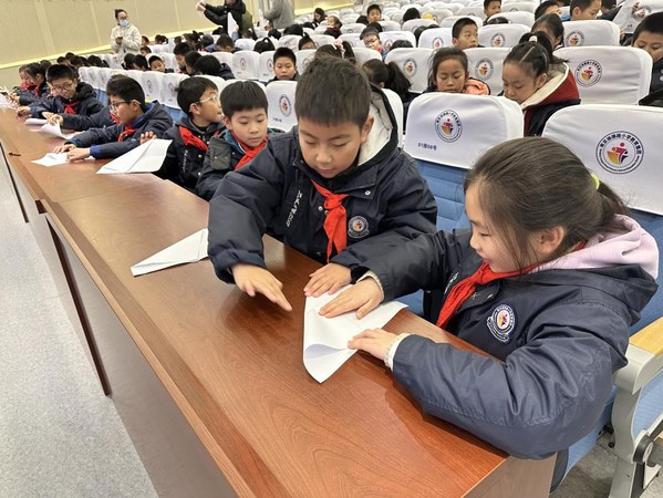 接下来是趣味折纸活动。志愿者代表从折纸的历史与折纸在航空、航天工程应用两个方面进行介绍,展示了折纸艺术的魅力,引得小学生们阵阵惊叹。活动的最后,志愿者代表通过讲解与演示结合的方式,指导小学生折叠歼-20纸飞机模型,寓教于乐,让他们在实践中收获成长。