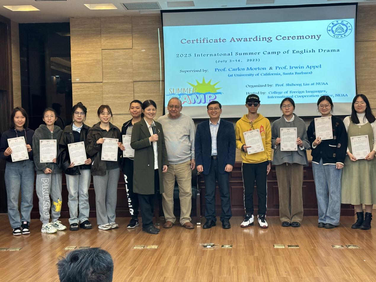 表演正式开始之前,进行了学校暑期国际课程“2023年度英语戏剧国际夏令营结营证书”发放仪式,该国际夏令营课程为外国语学院策划的特色国际课程、也是院团委组织的大学生暑期社会实践活动,目前已经连续举办四期,由加州大学的两位教授卡洛斯·莫顿和欧文·爱普(Irwin Appel)联袂执教,成为暑期课程中的热门课程。外国语学院副院长姜礼福教授和卡洛斯·莫顿教授亲自为学生们颁发了结营证书。