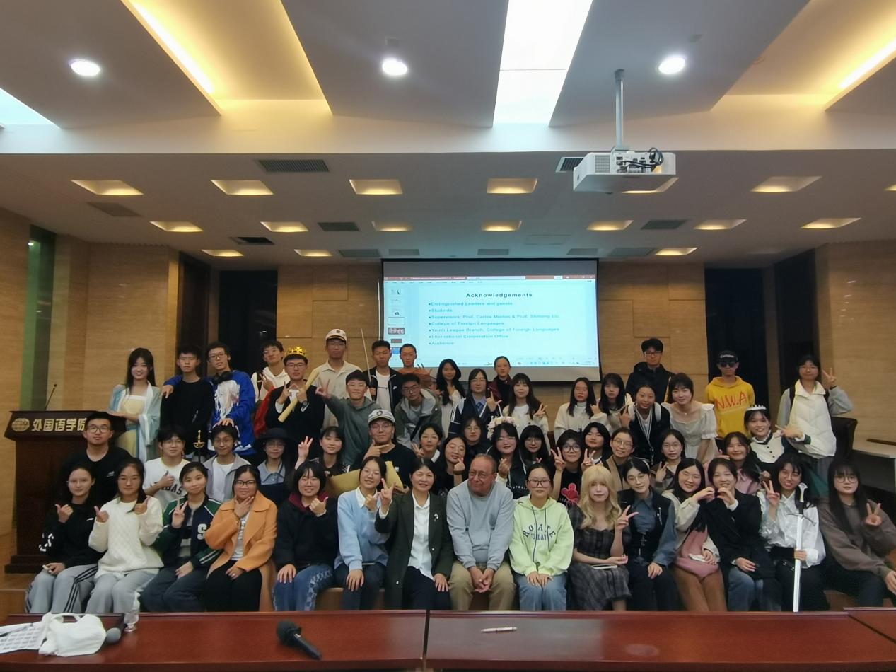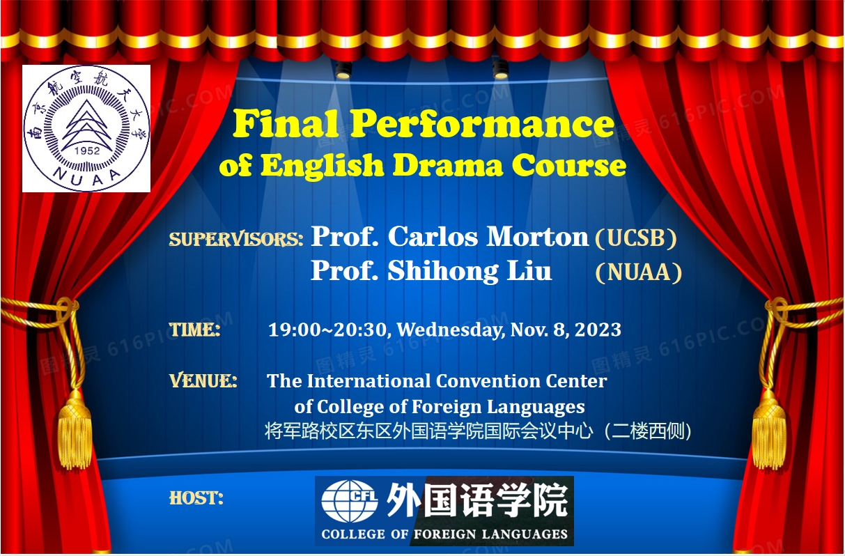 11月8日晚,外国语学院在国际会议中心成功举办了校通识课《英语戏剧》课程汇报演出。该课程由美国著名戏剧家、加州大学卡洛斯·莫顿(Carlos Morton)教授和外国语学院副教授刘世红联合授课。通过该课程,学生系统学习了戏剧的发展史和理论知识,重点分析研究了英国最伟大的戏剧家莎士比亚的四部经典戏剧、并进行模仿和改编,最后将自己的改编作品搬上舞台。