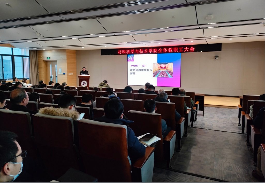 12月21日,材料科学与技术学院召开全体教职工大会暨学院领导班子述职述廉会议,传达学校近期重要会议精神,总结2023年度学院全面从严治党、人才培养、学科发展、师资队伍建设、科学研究、国际合作工作成效,并进一步分析发展形势,凝聚发展共识,就下一阶段推进学院高质量发展的重点工作进行部署。会议由学院党委书记石勇主持,学院全体领导班子成员、全体教职工参加了本次会议。