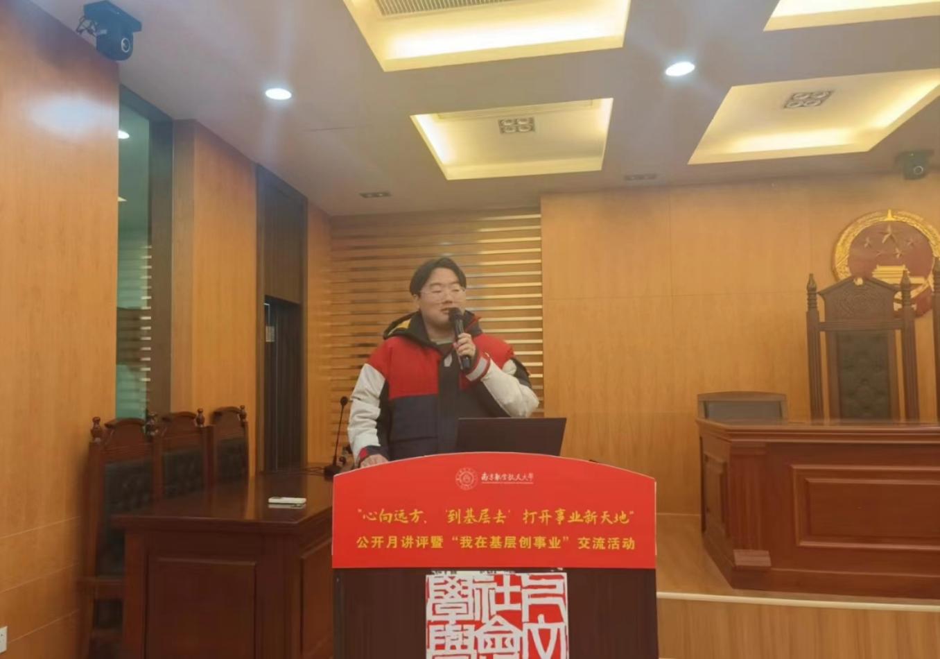 12月21日下午,“心向远方,‘到基层去’打开事业新天地”公开月讲评暨“我在基层创事业”交流活动在人文与社会科学学院模拟法庭举行。院党委副书记刘思辰以及2022级、2023级本科生共同参加,月讲评由本科生辅导员聂小芳主讲。