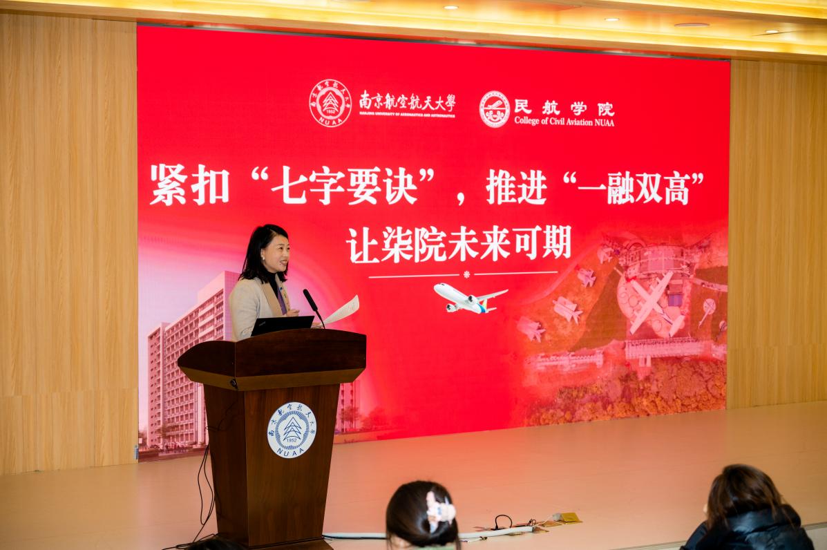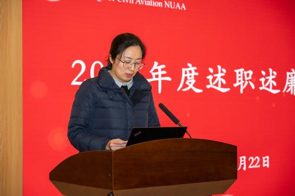首先,李君以《紧扣“七字要诀”,推进“一融双高”,让七院未来可期》代表学院党委作全面从严治党工作总结,并作个人述职述廉汇报。她紧扣“实”“深”“引”“严”“融”“暖”“稳”七个字,围绕学院政治建设、思想建设、组织建设、作风建设、“一融双高”等重要工作对学院2023年度全面从严治党工作进行了汇报。她表示,未来学院党委既要“操其要于上”,坚持和加强党对学院事业的全面领导,坚定不移推进新型工业化,赋能交通强国建设,又要“分其详于下”,创造性推动党建和业务深度融合,竭尽全力改革创新发展、全力以赴破解发展难题、用心用情服务广大师生,实现学院师生个人发展与学院事业发展同向同行,为特色鲜明的世界一流民航学院建设赋能添力。
