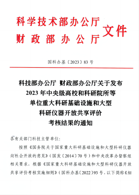 近日,科技部办公厅、财政部办公厅联合发布了《关于发布2023年中央级高校和科研院所等单位重大科研基础设施和大型科研仪器开放共享评价考核结果的通知》(国科办基〔2023〕83号),我校在此次考核中获得“优秀”等级,位居全国高校前十。