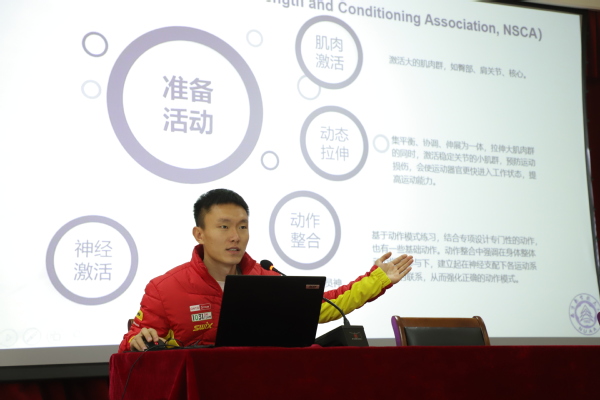 许猛以《教学体能提升与实施方案》为题,通过锻炼视频合集、科研数据表格以及教学实践案例切入,从体能构成的各项锻炼方法、关节与肌肉解剖学机理、体能锻炼各环节注意事项、与课程对标的体能训练实操方法四个维度入手,深入解析大学生体能提升问题。