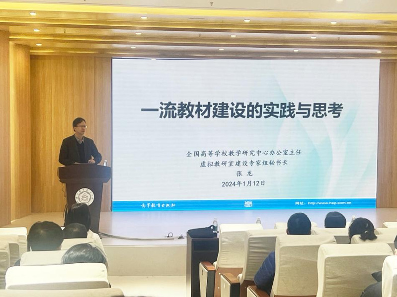 近日,教育部办公厅发布了《“十四五”普通高等教育本科国家级规划教材建设实施方案》,明确了“十四五”规划教材建设任务。为帮助广大教师熟悉教材建设政策、解答一流教材建设中存在的困惑和问题,学校于1月12日下午召开了“十四五”教材建设专家辅导报告会。报告会邀请了高等教育出版社工科事业部主任张龙作主题为“一流教材建设的实践与思考”的报告。各学院本科教学副院长、全国优秀教材培育项目建设团队、校级及以上教材项目负责人以及相关教学管理人员120余人参会。报告会由教务处副处长李晋斌教授主持。