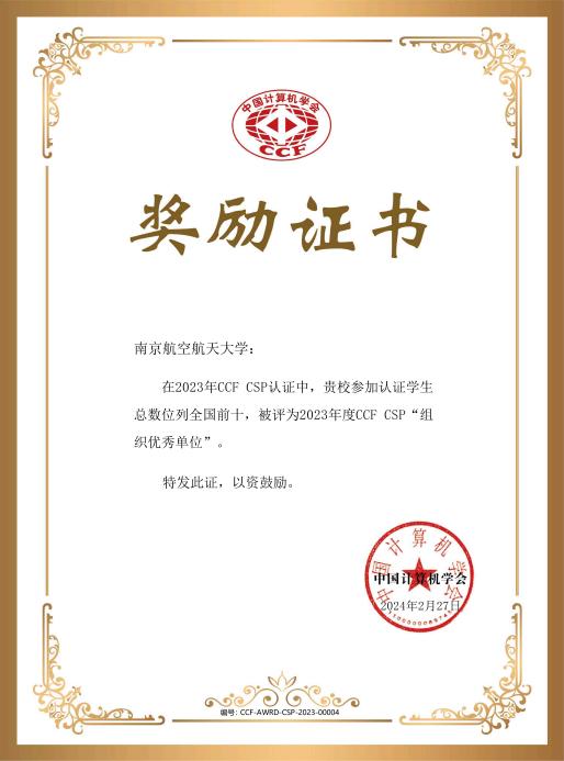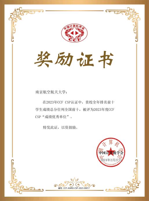 近日,中国计算机学会(CCF)公布了2023年度CSP认证考试优秀单位的评审结果,南京航空航天大学同时获评了“组织优秀单位”和“成绩优秀单位”。