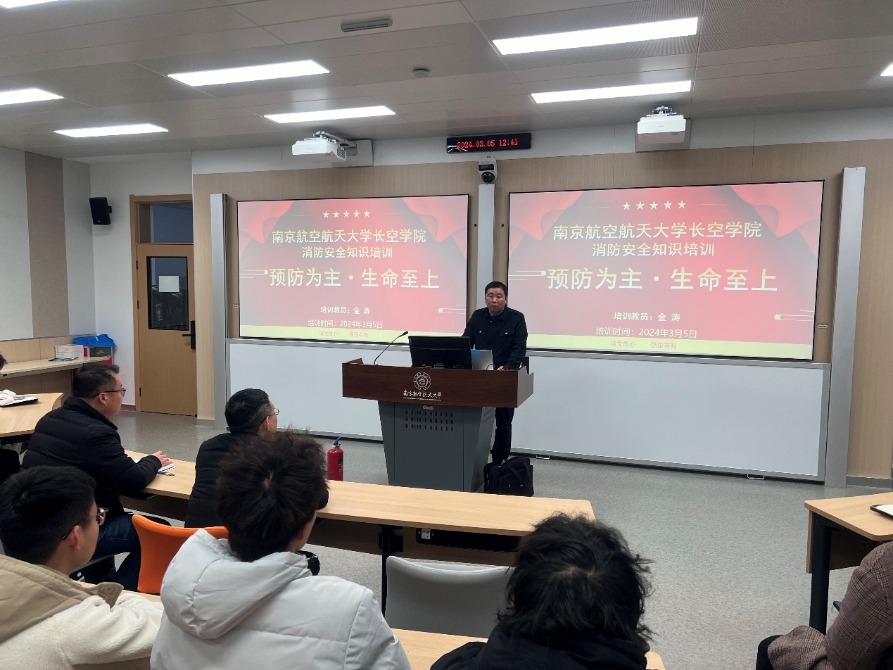 为了进一步加强学院的安全工作,提高师生的消防安全意识、风险防范和应急处置能力,3月5日,长空学院举办了一场消防安全培训。此次讲座邀请了经验丰富的消防专家金涛教官进行授课,学院全体教职工和学生安全员代表参加了此次培训。