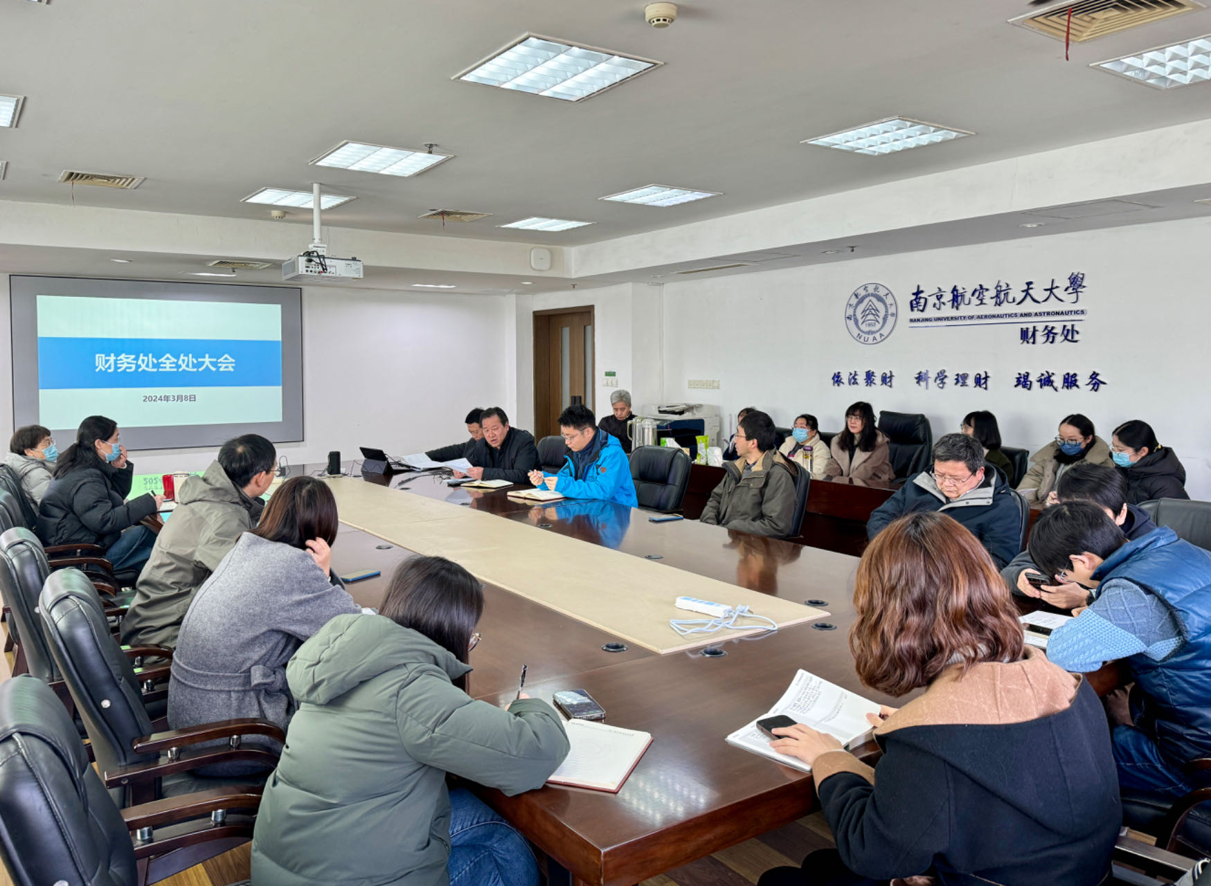 3月8日上午,财务处召开新学期全处教职工大会,学习贯彻上级及学校重要会议精神,研究部署新学期财务重点工作。