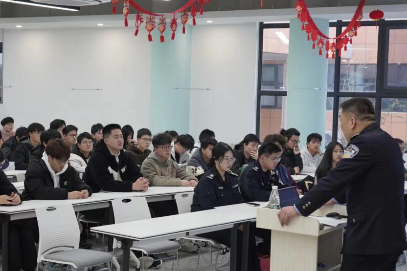 为持续推进平安校园建设,提升学生安全防范意识,不断汇聚校地协同育人合力,天目湖校区学工办与保卫处驻校区办公室邀请溧阳市古县街道派出所副所长周立群,在“一站式”学生社区文化活动室针对校区学生安全员队伍开展专题法制安全讲座,讲座由校区党工委副书记、学生处副处长贡海俊主持。