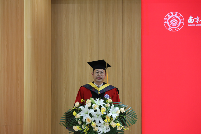 在庄严肃穆的国歌声后,孙建红作题为《乘风破浪启新程,昂首阔步向未来》的讲话。他向全体毕业研究生表示热烈的祝贺,向辛勤耕耘、无私奉献的研究生导师、教职员工及学生家长表示衷心的感谢。他寄语全体毕业生,要心怀“国之大者”,将个人的“小我”融入强国逐梦的“大我”。当前,民航科技创新、国产民机运维以及低空经济发展都是国家重大需求和历史机遇,特别“低空经济”在打造新质生产力、推动经济高质量发展的宏伟蓝图中占据重要作用,他号召广大民航学子要积极发挥学科优势及行业特色,走在先、做表率,贡献出奋力开辟低空经济新赛道的民航力量,汇聚起推进新型工业化的青年力量!最后,他指出,学生永远是学院的希望和牵挂,学院永远是院友的底气和港湾,希望同学们继续与学院携手同行,共同谱写交通强国建设民航新篇章。