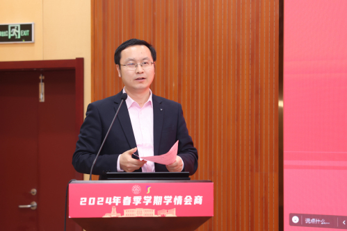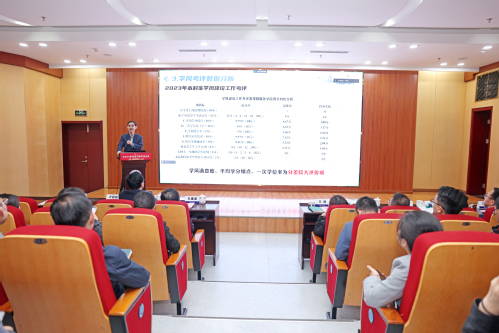 张跃结合2023年度本科生学风建设工作考核评估情况,就本科生学风建设的相关数据作分析报告。他从学风客观数据分析、学风调研数据分析、学风考评数据分析三方面详细分析了本科生学风现状和存在的问题,并对2024年本科生学风建设提出了相关建议。