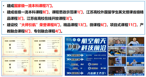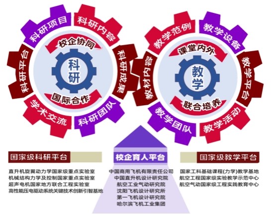 现代飞行器是高度复杂的集成系统,具有典型的新工科属性。为培育具备国际竞争力的高素质复合型新工科人才,学院以跨院系、跨学科、跨专业的“新工科”教育模式为依托,坚持横向融合与纵向贯通相结合,以院-院协同育人联盟为载体,通过“1+X”班主任团队、项目制实习、企业课程等举措,促进各要素汇聚、融合、相济,实现高水平的院-院协同、校企贯通、校际互动、国际互通,形成内循环和外循环相济共生的“跨界融合”协同育人生态。学院以汇聚校企优势资源为基础,开拓“学科交叉、校企联合、校际协同”资源融合路径,通过建立航宇与力学学科群,实现跨学科资源共享;通过建立校企联合实训基地和实验室等,实现校企育人资源共建互享;通过共建协同创新中心等方式,实现重大仪器设备校际共享、师资队伍优势互补;通过不断探索现代教育教学理念和方法,打造“金课”和高水平教材,深化课程思政教学改革,在高质量航空航天人才培养上有了新突破,取得了一批重大教学成果。