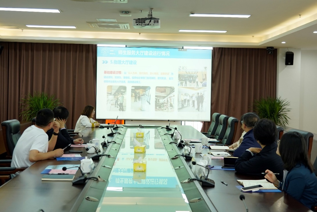 天目湖校区管委会党政办主任寇晓洁汇报了我校师生服务大厅的建设背景、运行情况,并对师生服务大厅管理办法进行了解读。双方就师生服务大厅建设、管理以及日常运行等方面进行了深入交流。