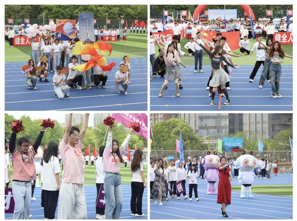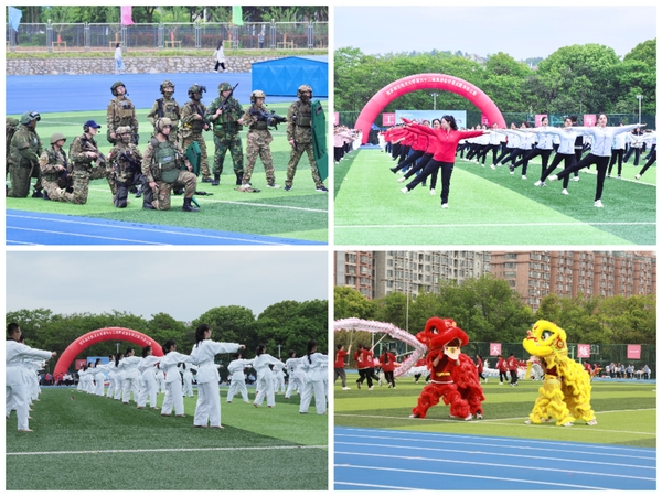 国防运动展示首先映入大家的眼帘,演员们一套套迷彩绿精神抖擞,动作流利干脆,展现了南航学子的少年英姿。教职工广播操表演上,老师们昂首阔步,精神抖擞。平日里他们默默耕耘在自己的岗位上,如今他们在田径场上展现昂扬的精神风貌,为鼓励同学们积极参与体育运动发挥了榜样作用。跆拳道表演由七个学院的140名同学参演,选手们昂首挺胸,气势如虹,动作整齐划一,刚柔并济,洋溢着青春的气息,一招一式尽显活力。龙狮表演团体由14个学院200余名学生组成,舞龙舞狮是国家级非物质文化遗产,充分体现民族精神,展现团结力量,彰显文明底蕴。龙虎精神抖擞,催人振奋。