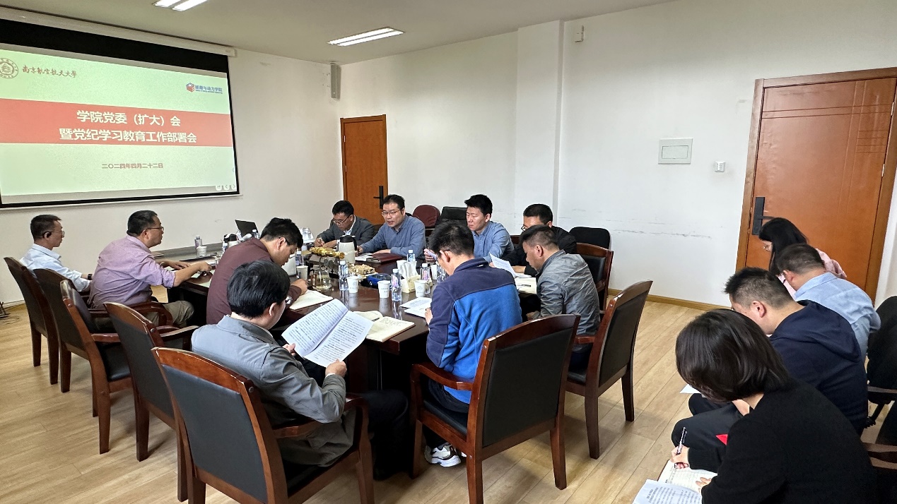 为扎实开展党纪学习教育,落实学校党委工作要求,4月22日,能源与动力学院召开党委(扩大)会暨党纪学习教育工作部署会,学院党委委员、领导班子成员和全体教工党支部书记参会。会议由学院院长毛军逵主持。