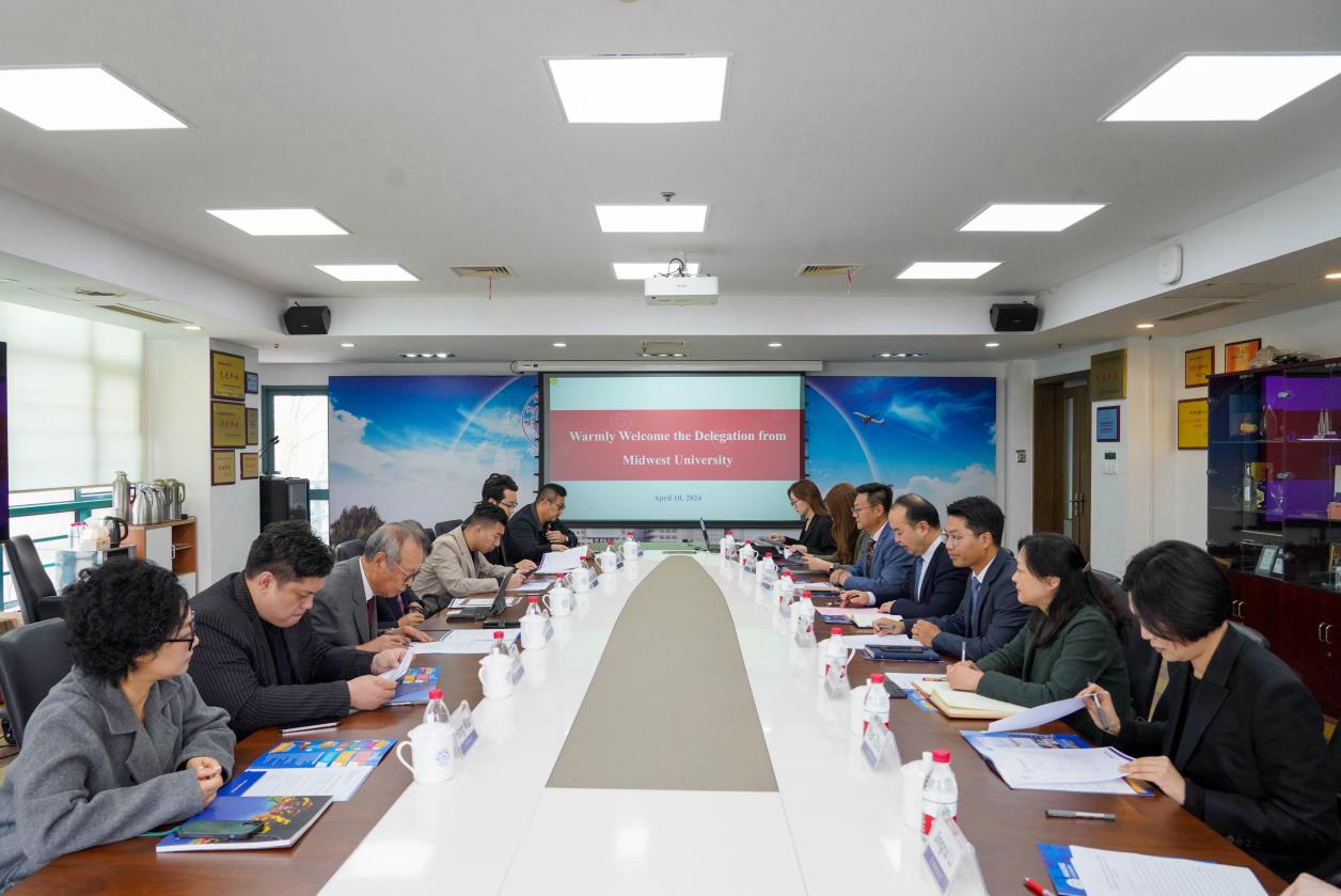 4月10日,美国中西部大学校长James Song一行访问我校。校党委副书记陶勇代表学校会见来宾并开展座谈。座谈会由国际合作处副处长张国权主持,艺术学院党委书记张钟勤、院长板俊荣、院党委副书记王宇宁和副院长朱琰参加座谈。