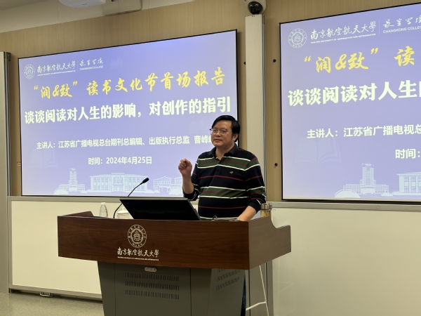 4月25日下午,著名作家、江苏省广播电视总台期刊总编辑、出版执行总监、长空学院“润&致”文化导师曹峰峻老师做客“大”学长空师生交流活动暨“润&致”读书文化节首场报告,以“谈谈阅读对人生的影响,对创作的指引”主题,与长空学院60余名师生开展交流。