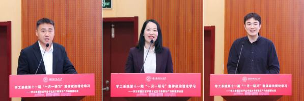 计算机科学与技术学院魏明强教授以《大模型激活新质生产力发展新引擎》为题,围绕新范式、新时代、新机会、新高度等方面讲解了以大模型为代表的人工智能技术在助推新质生产力发展方面发挥的重要作用。袁伟伟教授从“教工党支部书记、教书先生、研究生导师”三个身份出发,阐述了人工智能技术对于赋能新质生产力发展,助推培养拔尖创新人才的重要作用。本科生辅导员王叶飞以《向新向质而行,让教育从“指间”入“心间”》为题,站在育人一线的角度,分享了自身提升新质思政工作能力的心得和思考体会。