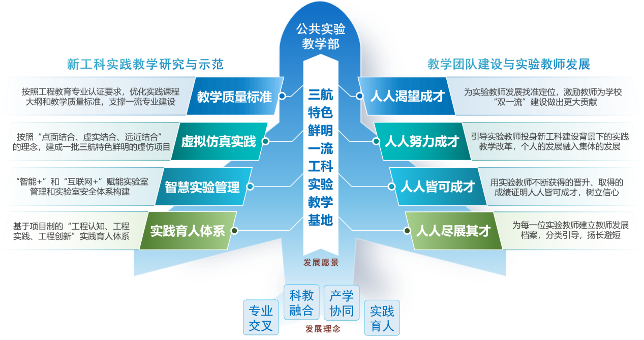 公共实验教学部成立三年多来,秉持“专业交叉、科教融汇、产学协同、实践育人”的发展理念,以建设成为以“三航”为特色的一流工科实验教学基地为发展愿景,以虚拟仿真实验教学和PI(首席责任教授)制创新实践指导为两个重点发展方向,针对实验教师队伍建设,落实组建教学科研团队、成立教师发展分中心、引入学科资源带动实验教师成长三项举措。在此基础上构建起以发展愿景和发展理念为主线,以新工科实验教学研究与示范、实验教师发展与人才强布战略为重要抓手的“一体两翼”发展体系,通过夯实质量基础,创新用人机制,鼓励数字化赋能教学改革,强化学生自主研学实践等举措,牢牢锚定高质量发展这一首要任务,全面推动学校公共实验实践教学高质量内涵式发展。