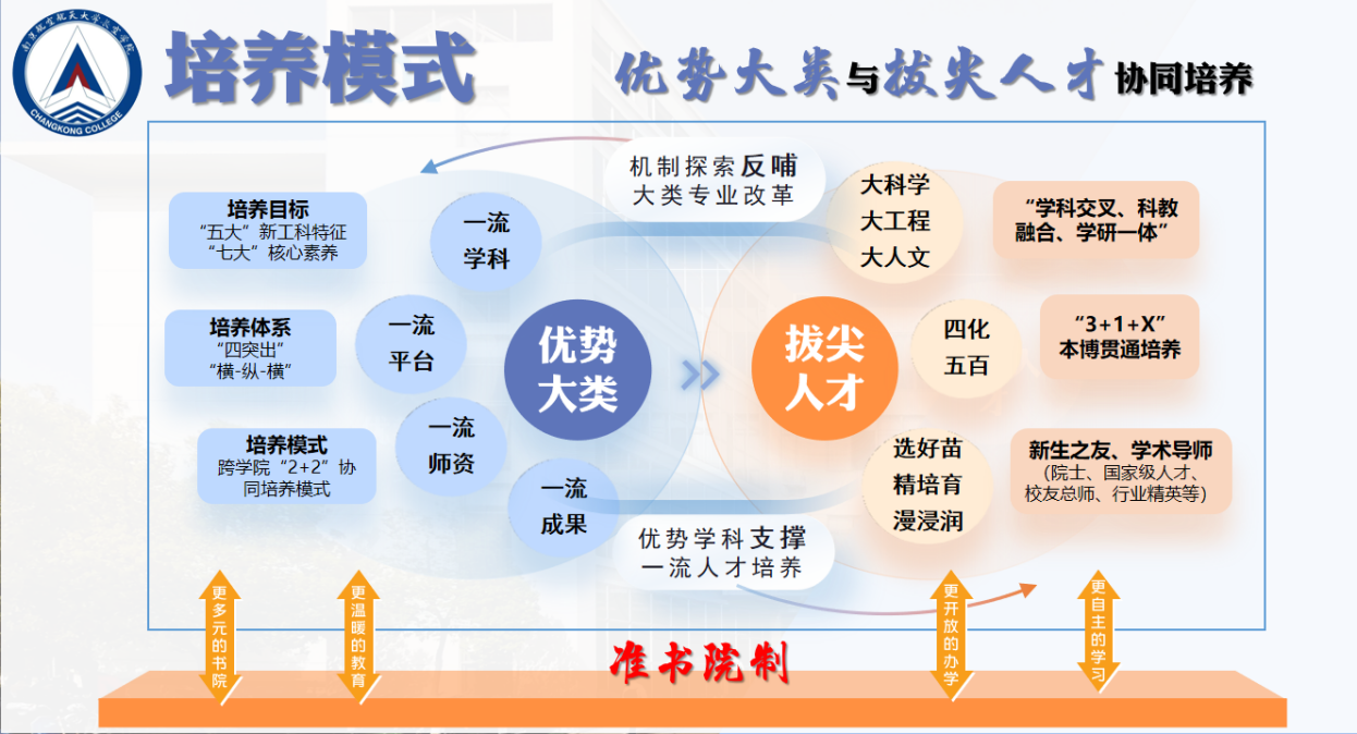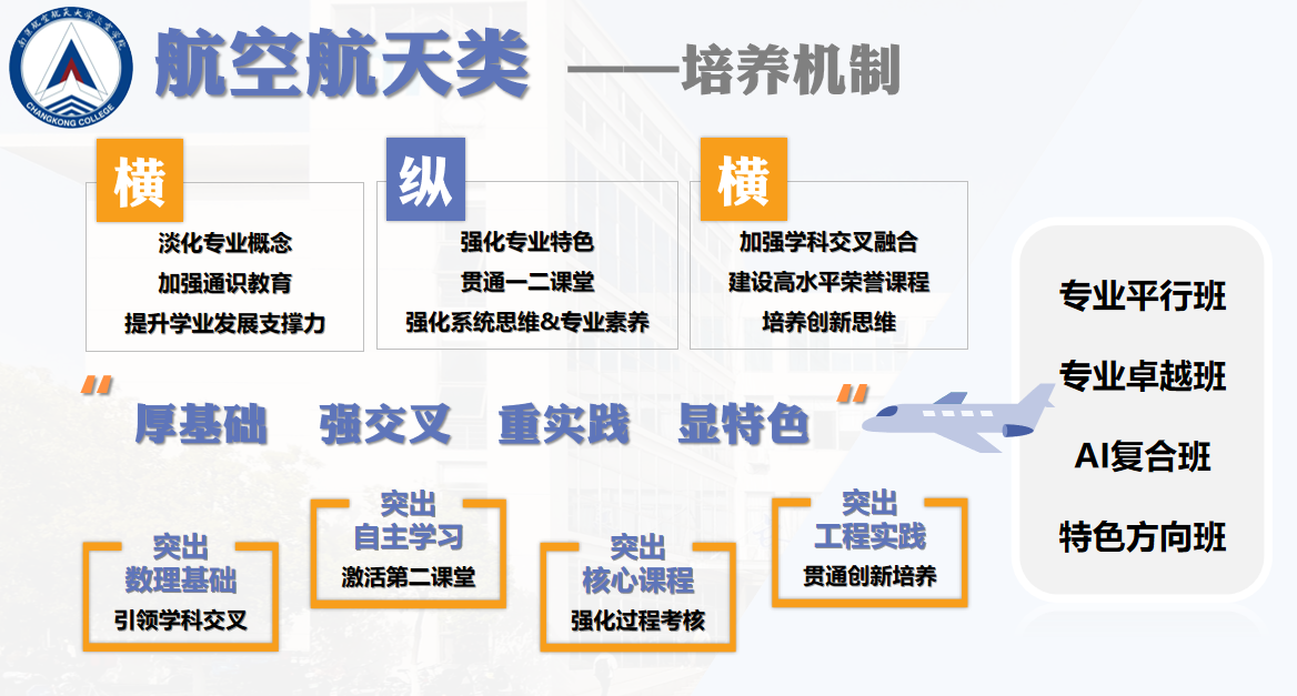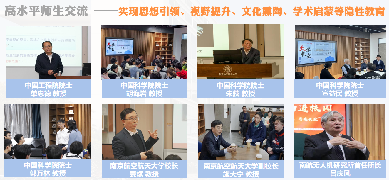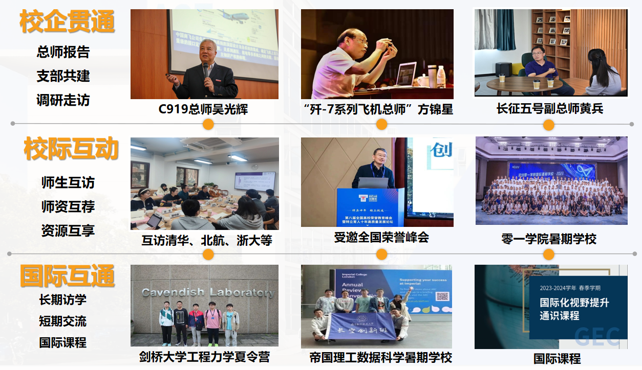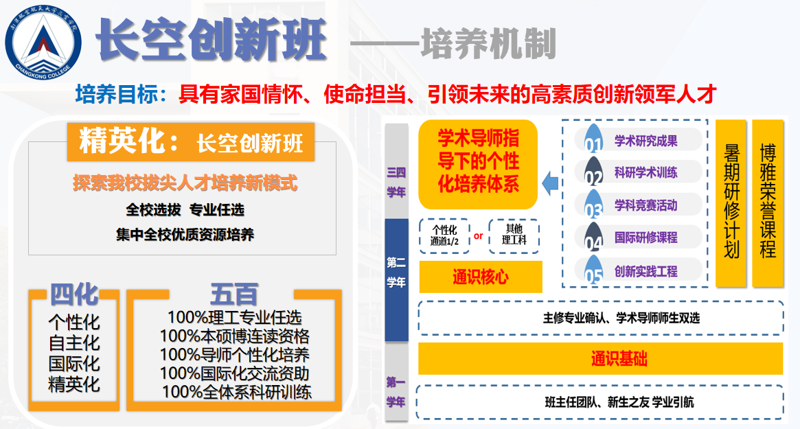 学校以长空创新班为试点,实行四年一贯制下的“学科交叉、科教融合、学研一体”拔尖创新人才培养综合改革,试点推行“3+1+X”本博贯通培养和师资选留特别支持政策,强调人才培养目标与国家战略需求相契合、精深学习与贯通培养相结合,以“四化、五百”培养机制构建了“大科学、大工程、大人文”为表征的拔尖创新人才培养体系,实行以学术成果和科研水平为导向的学业评价体系和选培机制,选配院士、国家级人才、校友总师、行业精英等为新生之友、学术导师,打破专业壁垒和学科边界,实行“四年不断线”的全体系科研训练和专项资助计划。