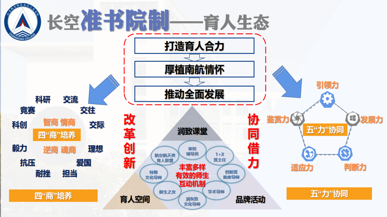 多年来,长空学院聚焦“一流的环境怡悦学生、一流的资源面向学生、一流的教师融入学生、一流的管理服务学生、一流的文化熏陶学生、一流的品格塑造学生”的“六个一流”育人定位,以“更多元的书院、更温暖的教育、更开放的办学、更自主的学习”满足学生个性化、精准化、智慧化成长需求,探索优势大类与拔尖人才“双轨并进”协同培养新机制,建设数字赋能下的 “准书院制”全场域智慧教育空间新载体,构建内外循环相济共生的“跨界融合”协同育人新生态,形成了“润&致”文化体系下“多主体参与、多要素耦合、多生态共济”的有组织育人共同体,为行业特色型高校拔尖创新人才自主培养提供了“南航范式”。