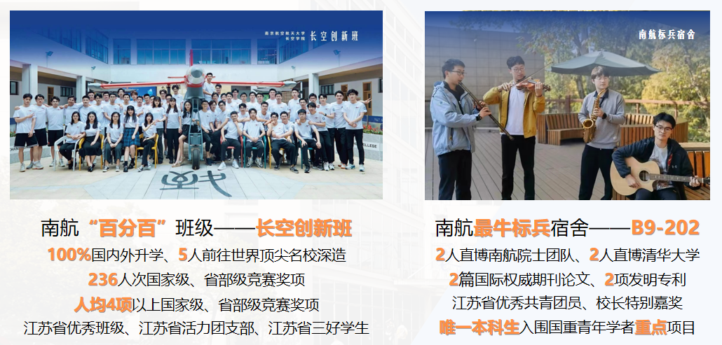 学生荣获省部级及以上竞赛奖励1800余人次,包括“挑战杯”全国大学生课外学术科技作品竞赛“揭榜挂帅”特等奖、中国国际大学生创新大赛金奖、中国国际飞行器设计挑战赛一等奖、国际大学生力学竞赛一等奖、美国大学生数学建模竞赛Finalist特等奖提名等高水平竞赛奖项;学生获批大学生创新训练项目立项近800项,长空创新班100%主持或参与大创项目,大创研究成果受到院士等高度评价;涌现出南航“百分百”班级和最牛标兵宿舍,拔尖创新人才培养硕果累累。