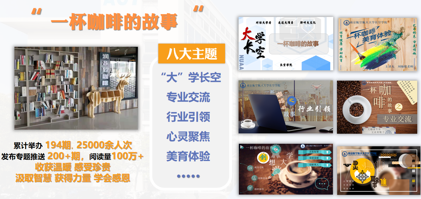 为落实立德树人根本任务,长空学院立足学生需求,深入挖掘育人要素,打造“润 & 致”文化之“一杯咖啡的故事”师生交流活动。“一杯咖啡的故事”每周举办 2-3 期,每期一个话题,邀请校内外专家面向 30 名左右的学生展开交流。活动包含“大学长空”“专业交流”“美育交流”“心灵聚焦”等 8 个模块,以品味咖啡、漫谈聊天的形式,用教师的“润”促进学生的“致”,让学生在交流中收获温暖、感受珍贵、汲取智慧、获得力量、学会感恩。活动突破师生交流界限 , 有效解决了师生交流中缺少温度、形式单一等问题,增强了活动的亲和力和针对性, 满足了学生成长发展的需求和期待。