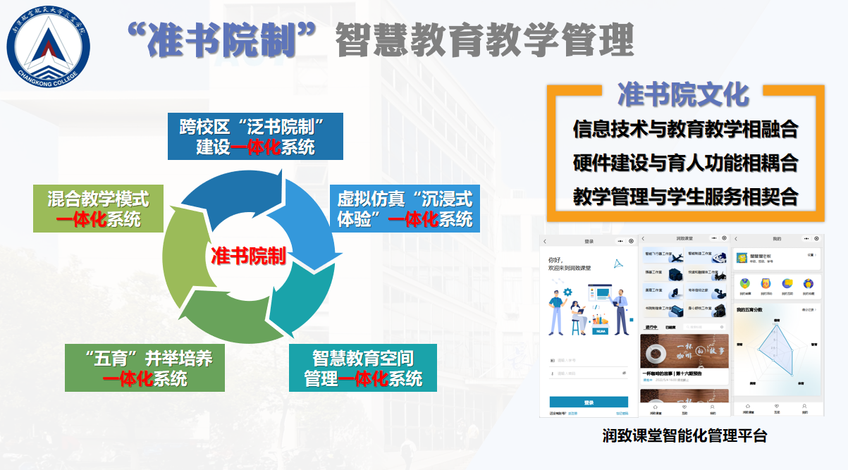 以数字赋能“准书院制”智慧教育教学管理,规划建设有混合教学模式、虚拟仿真“沉浸式体验”、“五育”并举培养等一体化教育管理信息系统,实现线上线下学习、科研、教学、生活等功能融通;搭建有“润致”课堂智能化管理平台,形成“专人负责、教师指导、学生自治”的学生管理运行体系。多效并举,实现了信息技术与教育教学相融合、硬件建设与育人功能相耦合、教学管理与学生服务相契合。