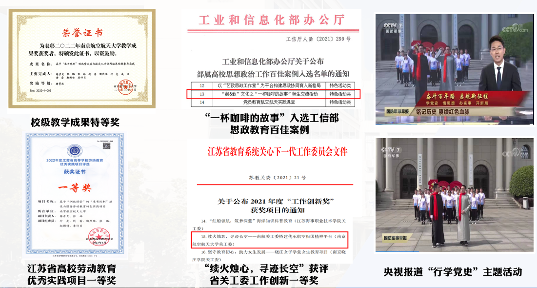 五年来,长空学院先后获校教学成果奖特等奖、一等奖、二等奖各1项,牵头省教改类重点课题3项,承担各类校级课题20余项;特色主题活动辐射引领效应不断凸显,其中“行学党史”主题活动得到中央电视台报道;“一杯咖啡的故事”特色活动入选工信部部属高校思政教育“百佳”案例;“续火烛心·寻迹长空”特色品牌活动被江苏省教育关工委评为工作创新一等奖;“准书院制”建设与服务项目获江苏省高等学校劳动教育优秀实践项目一等奖等多项荣誉。