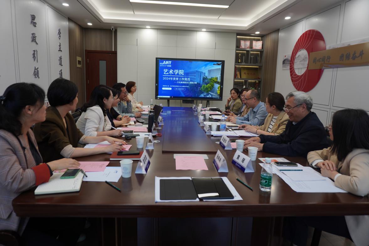 艺术学院院长板俊荣首先引导大家重温了习近平总书记对于全国宣传思想文化工作的重要指示精神和出席文化传承发展座谈会上的讲话精神,以及关于文化强国的重要论述,并从指导思想、任务目标、工作举措等方面,逐条解读了《教育部关于全面实施学校美育浸润行动的通知》。通过学习,与会人员增强了对于习近平文化思想丰富内涵的理解和领悟,坚定了文化自信和使命担当,并明确了推动和丰富美育教育的方法路径。