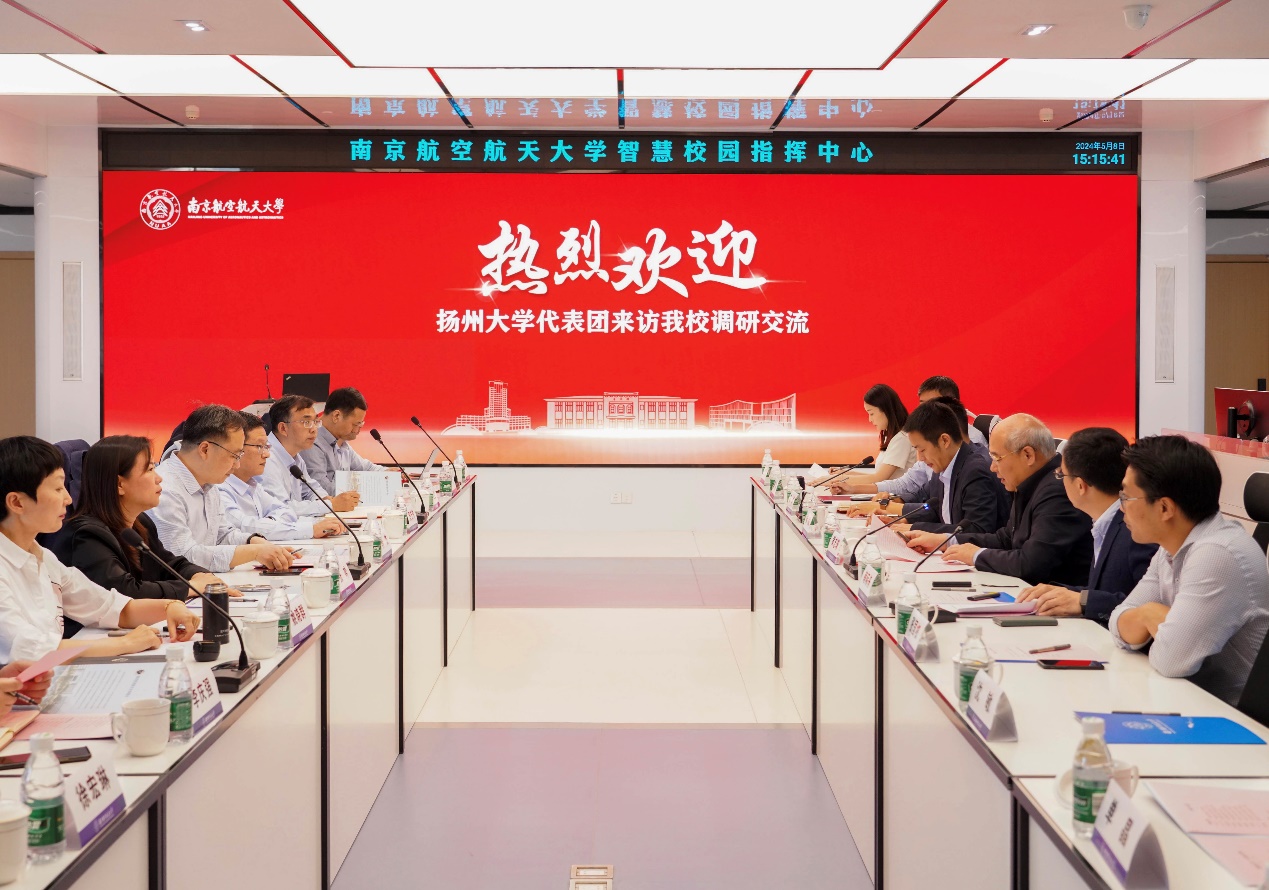 黄志球代表学校对韩杰一行来访表示欢迎,并向来宾介绍了南航的基本情况。他指出,近年来,南航在国际合作、网络安全和信息化建设以及来华留学教育等方面不断提升管理和服务水平,取得了较为显著的成绩。扬大与南航共同扎根江苏、服务江苏,长期以来缔结了深厚友谊。期待双方进一步加强联系与合作,围绕国家重大战略和区域经济社会发展,发挥各自优势特色,开展更多领域务实合作,为“强富美高”新江苏现代化建设和教育强国建设作出新的贡献。