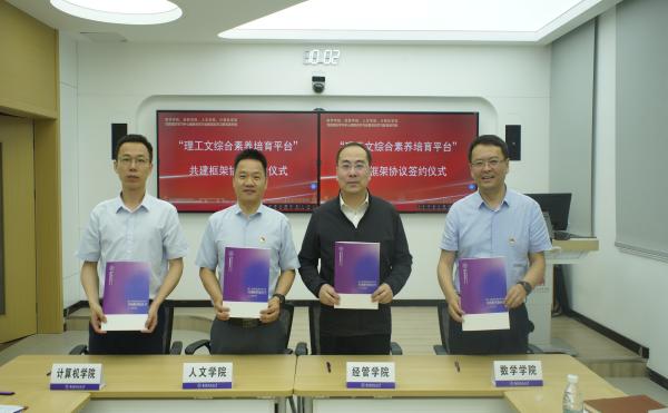 学习交流结束后,数学学院院长王春武、经管学院党委书记苏州、人文学院院长高志宏和计算机学院副院长(主持工作)黄圣君分别代表四个学院签订了“理工文综合素养培养平台”共建框架协议,并就共建理工文党建“一融双高”赋能提质平台、“四有”好老师队伍、“三融”课程思政体系、复合创新拔尖人才培养体系、跨学科交叉研学平台达成共识。