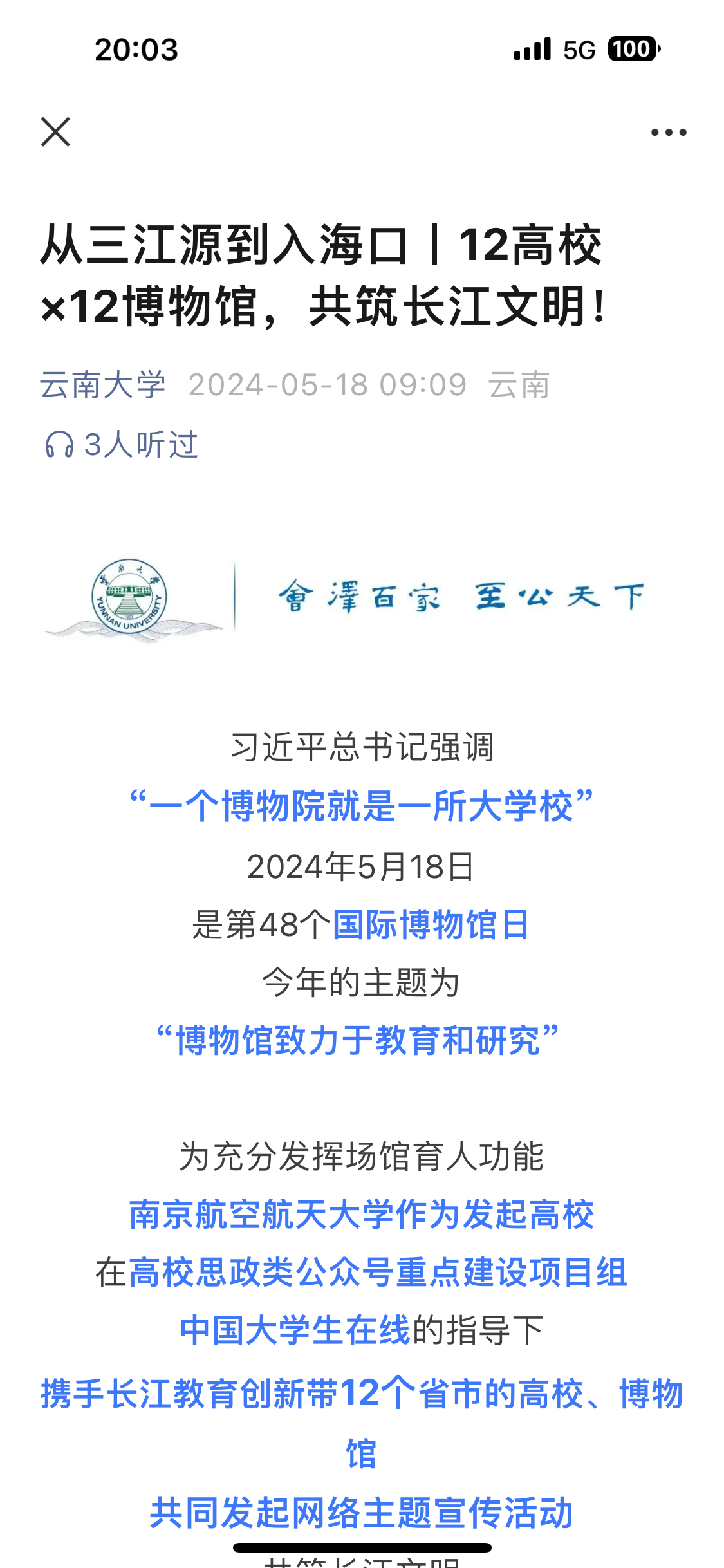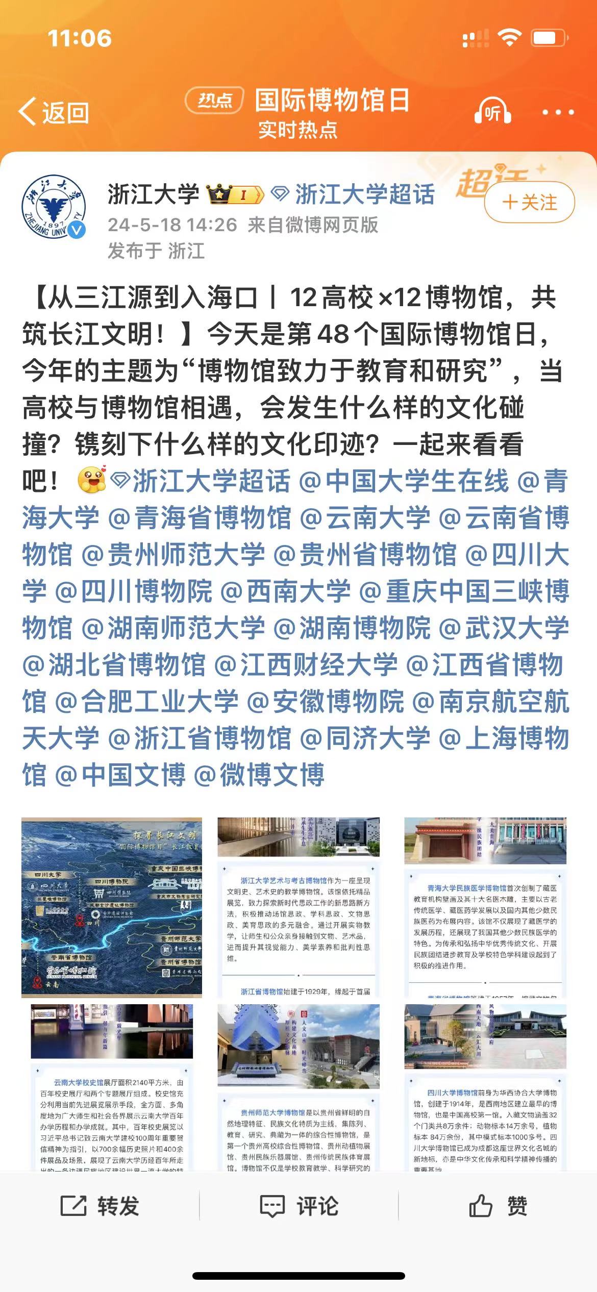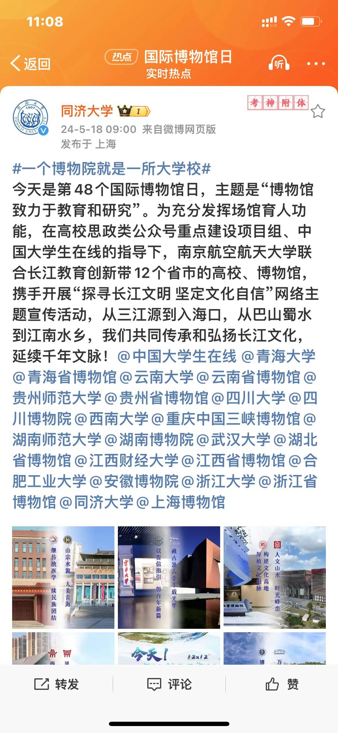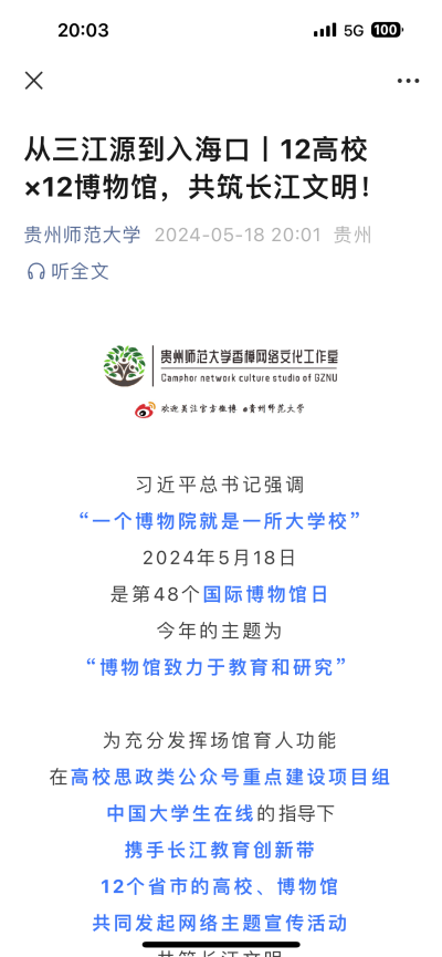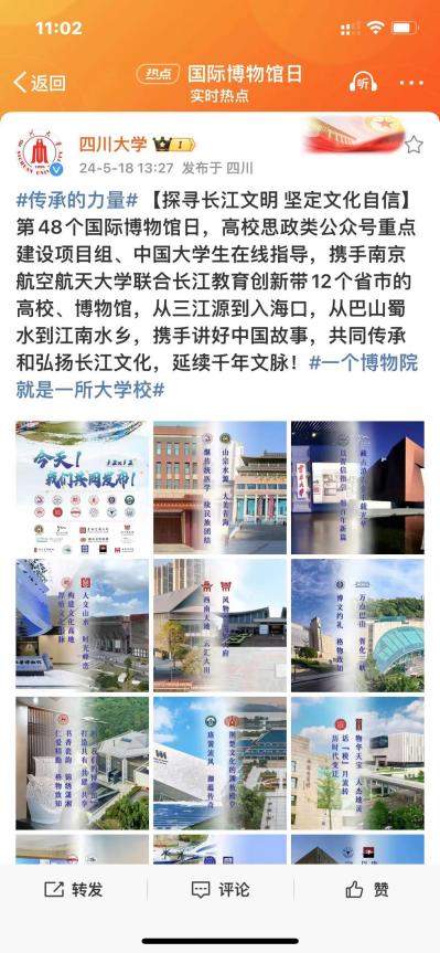 青海、云南、贵州、四川、重庆、湖南、湖北、江西、安徽、浙江、江苏、上海等长江教育创新带12个省市的高校、博物馆同时在各自官方微信和微博上推送精彩内容,展示12所高校和地方博物馆特色。通过联合展示博物馆文化,同上一堂传统文化的教育大课,让更多长江流域历史文明照进现实,让校园教书育人的文化氛围更加充盈,让中华传统文化得到更好地传承弘扬。