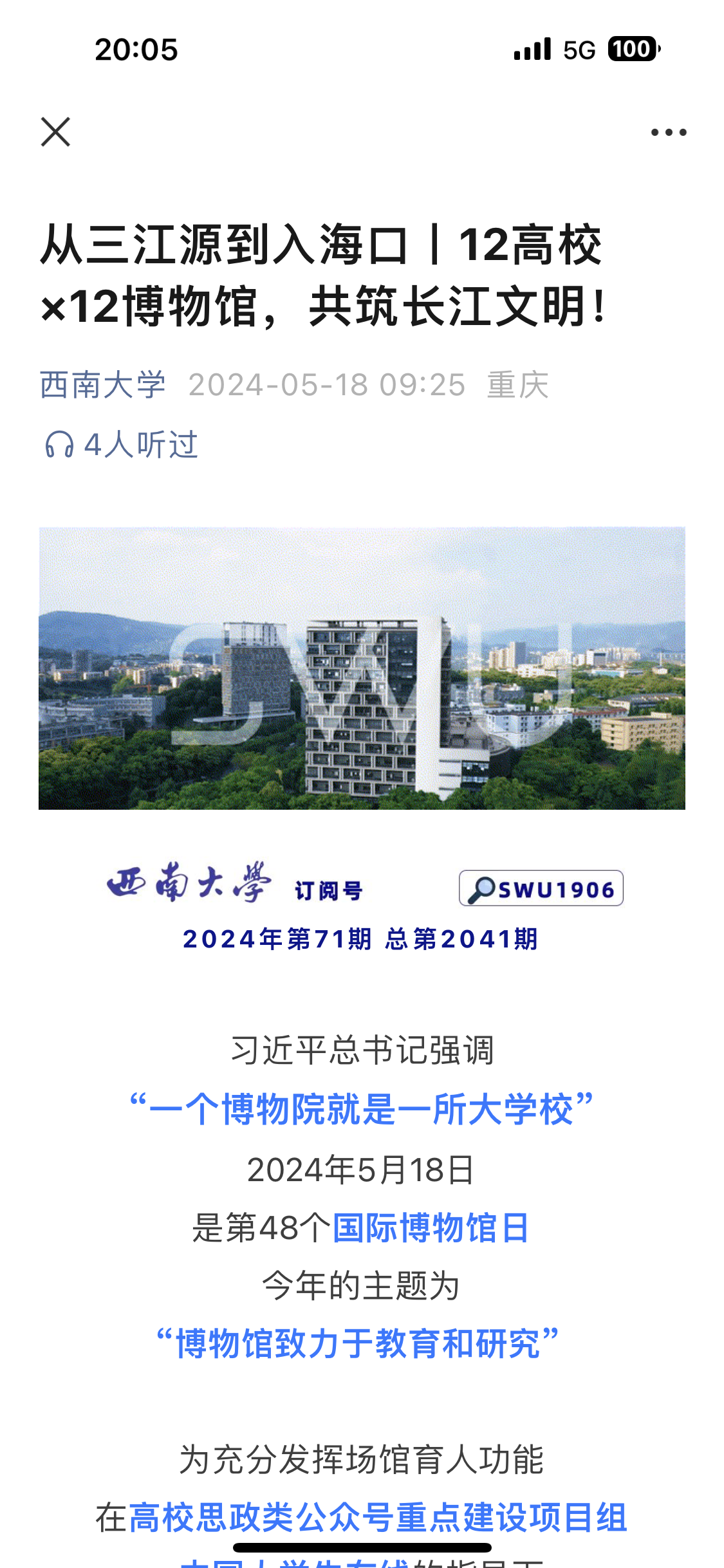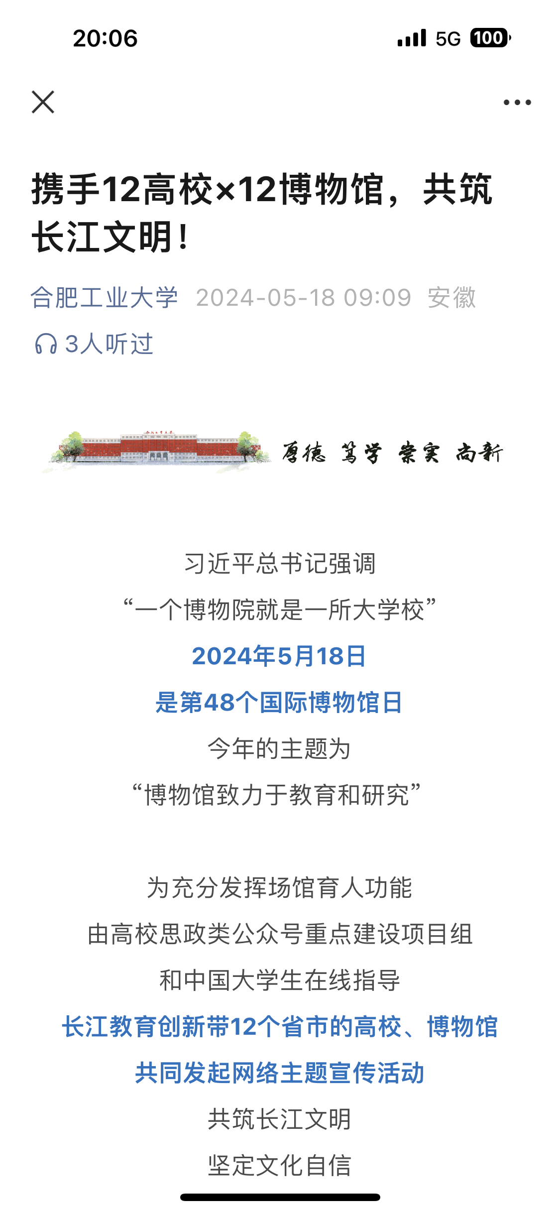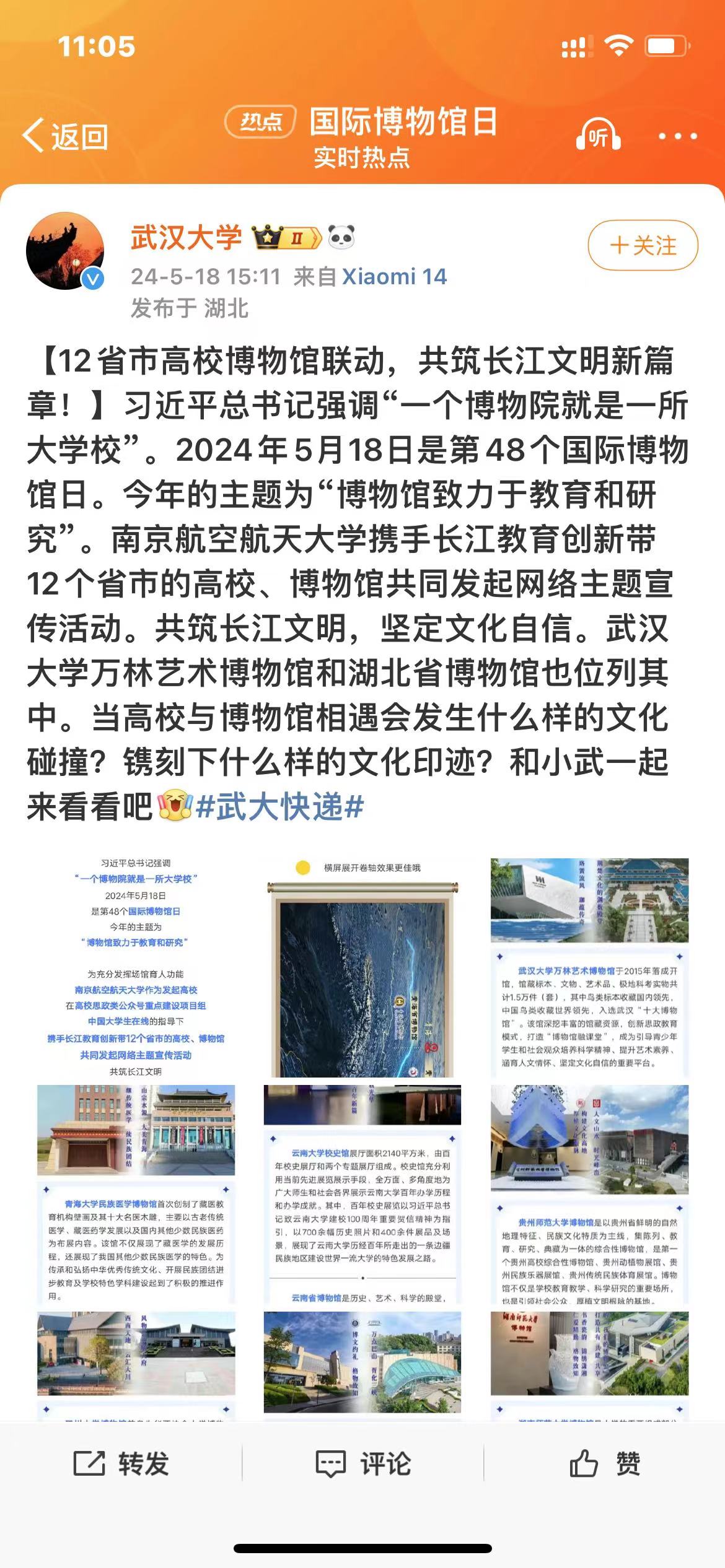 5月18日,国际博物馆日当天,在高校思政类公众号重点建设项目组、中国大学生在线的指导下,由我校发起,联合长江教育创新带12个省市的高校和12所博物馆,携手开展了“探寻长江文明 坚定文化自信”网络主题宣传活动,当天,我校还举行了国际博物馆日公众开放日活动。