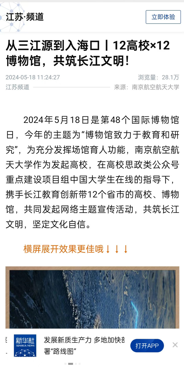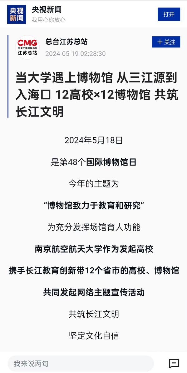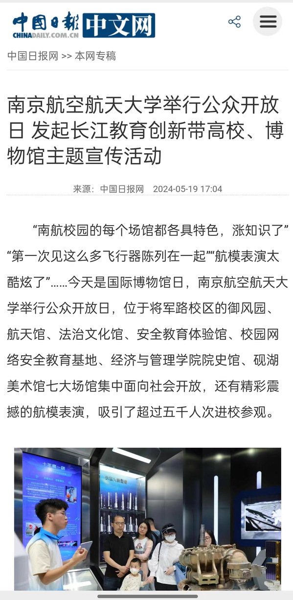 作为此次网络主题活动的主发起学校,去年六月份,我校在全国率先推出“文化传承·南航行动”长江文明系列思政公开课,与长江沿线20座博物馆共同成立“长江教育创新带优秀传统文化思政大课联盟”,并开设“长江文明系列讲座”公共选修课,至今已邀请8位沿线博物馆长进校园授课。