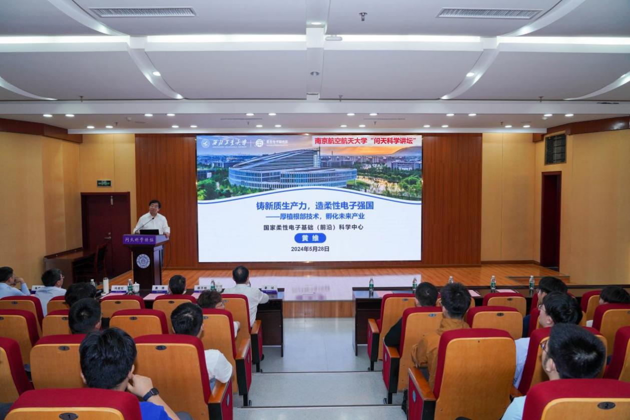 5月28日,我校第240期问天科学讲坛在将军路校区图书馆一楼报告厅举办。中国科学院院士黄维为师生讲授题为《铸新质生产力,造柔性电子强国——厚植根部技术,孵化未来产业》的报告。校长姜斌,校国际前沿科学研究院院长郭万林院士出席,校科协秘书长冯绍红、电子信息工程学院常务副院长潘时龙参加活动,近200名师生现场聆听授课。报告会由姜斌主持。