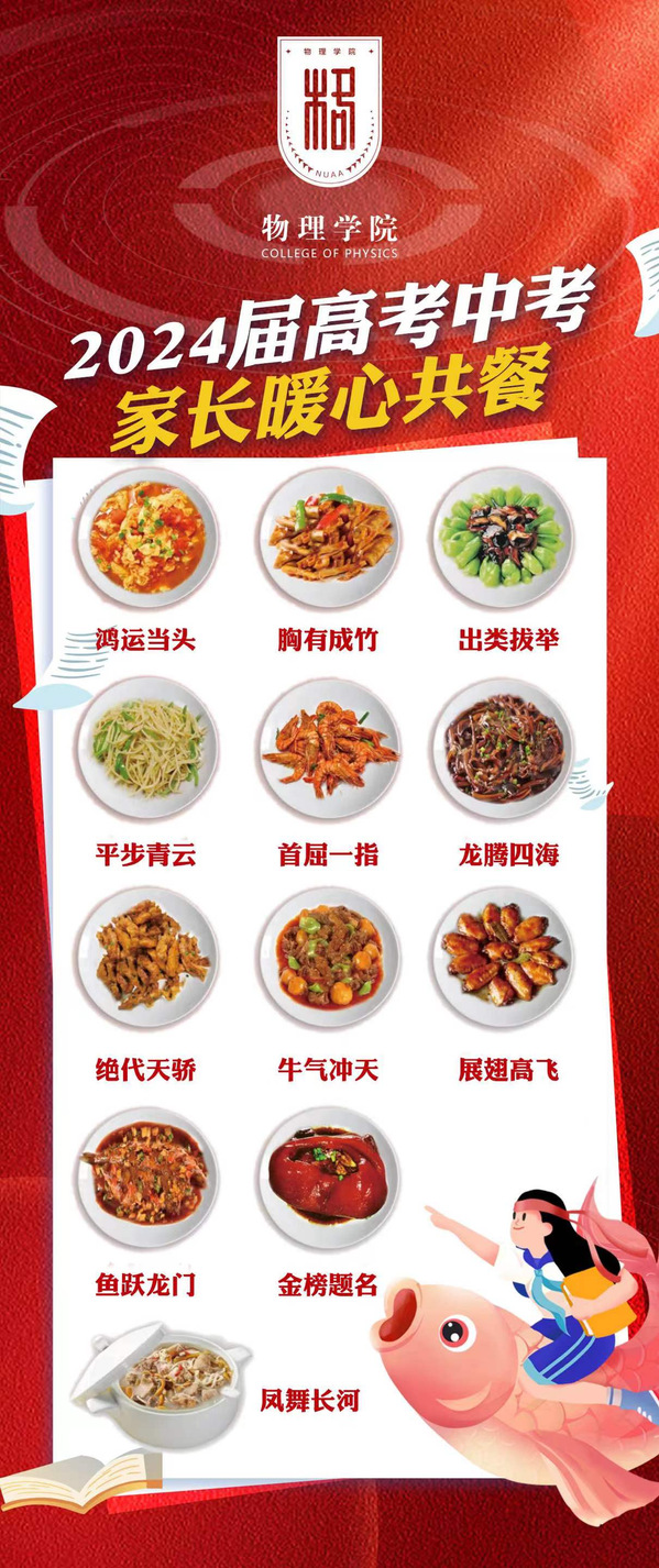 加油餐中祝福满,高中粽里情意浓。“暖心祝福餐”是学院对教职工子女们的一份深情厚意。金榜题名,鱼跃龙门,鸿运当头……精心设计每一道菜名,希望讨个好彩头,期待物理学院教职工子女能够胸有成竹、出类拔萃、平步青云、展翅高飞。