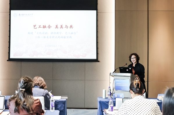 杨莉莉在会上作了题为《以美育人,美美与共——构建“文化浸润、课程教学、艺工融合”三位一体美育模式的南航实践》的交流汇报。杨莉莉从打造高品质校园文化供给、构建高层次交叉课程体系、建设高水平实践育人基地等三个方面,分享了我校立足“航空航天民航”特色,坚持艺工融合、以美育人的经验做法。