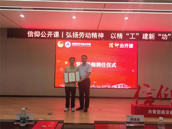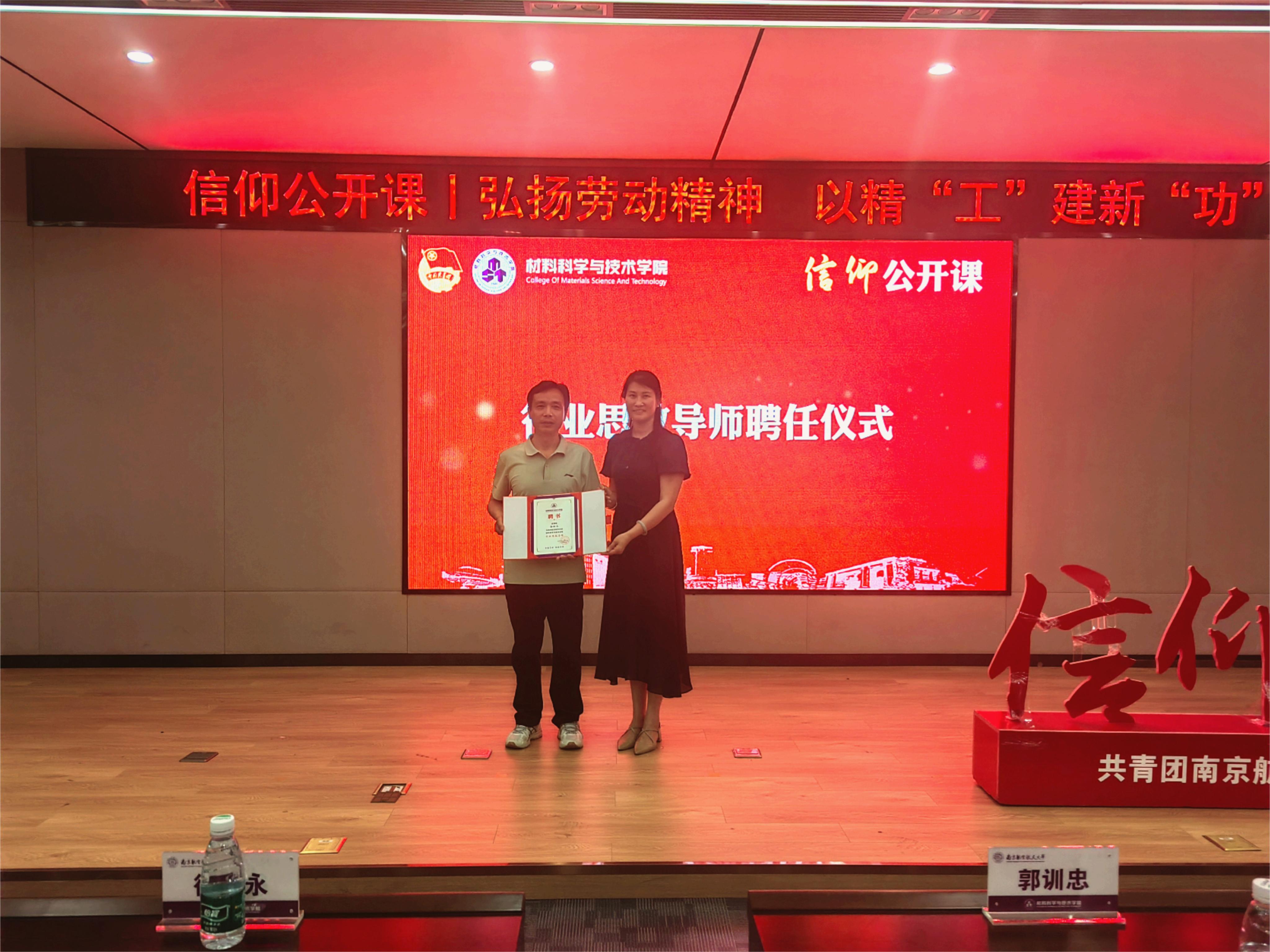 徐树永长期扎根兵器制造一线,肩负为国铸重器的使命任务,心系南航发展和青年学生的成长成才。公开课上,院党委副书记庄晓舒和副院长郭训忠分别为徐树永颁发“材料科学与技术学院行业思政导师”“柔性成形技术及装备团队纵向党支部党建导师”聘书。