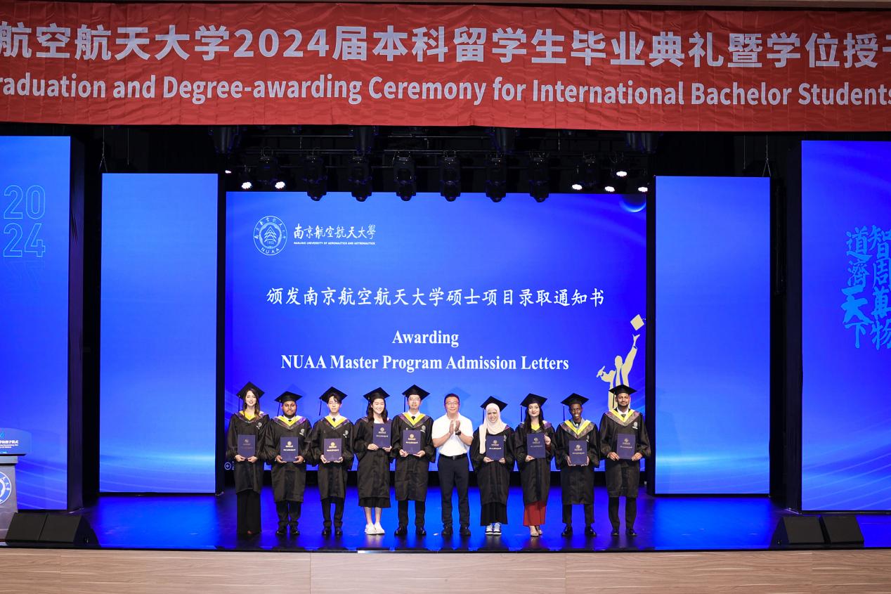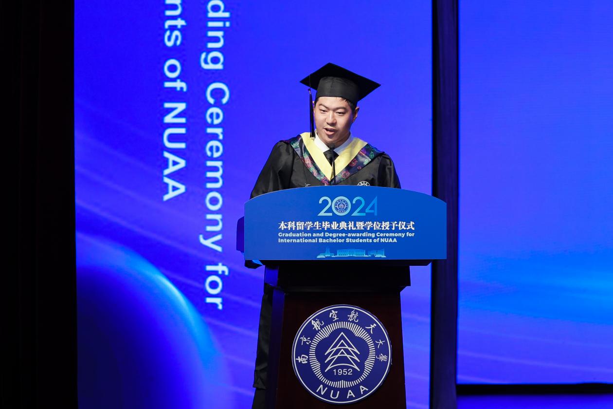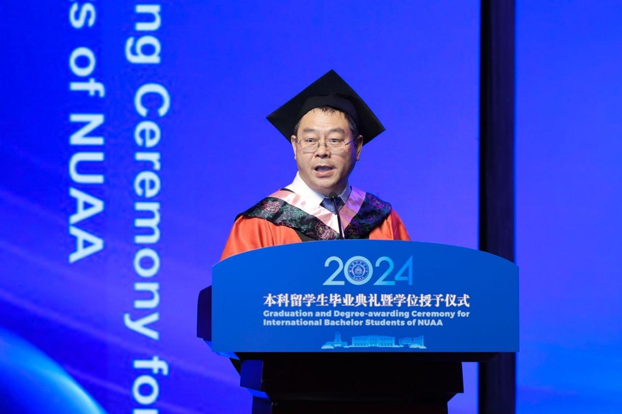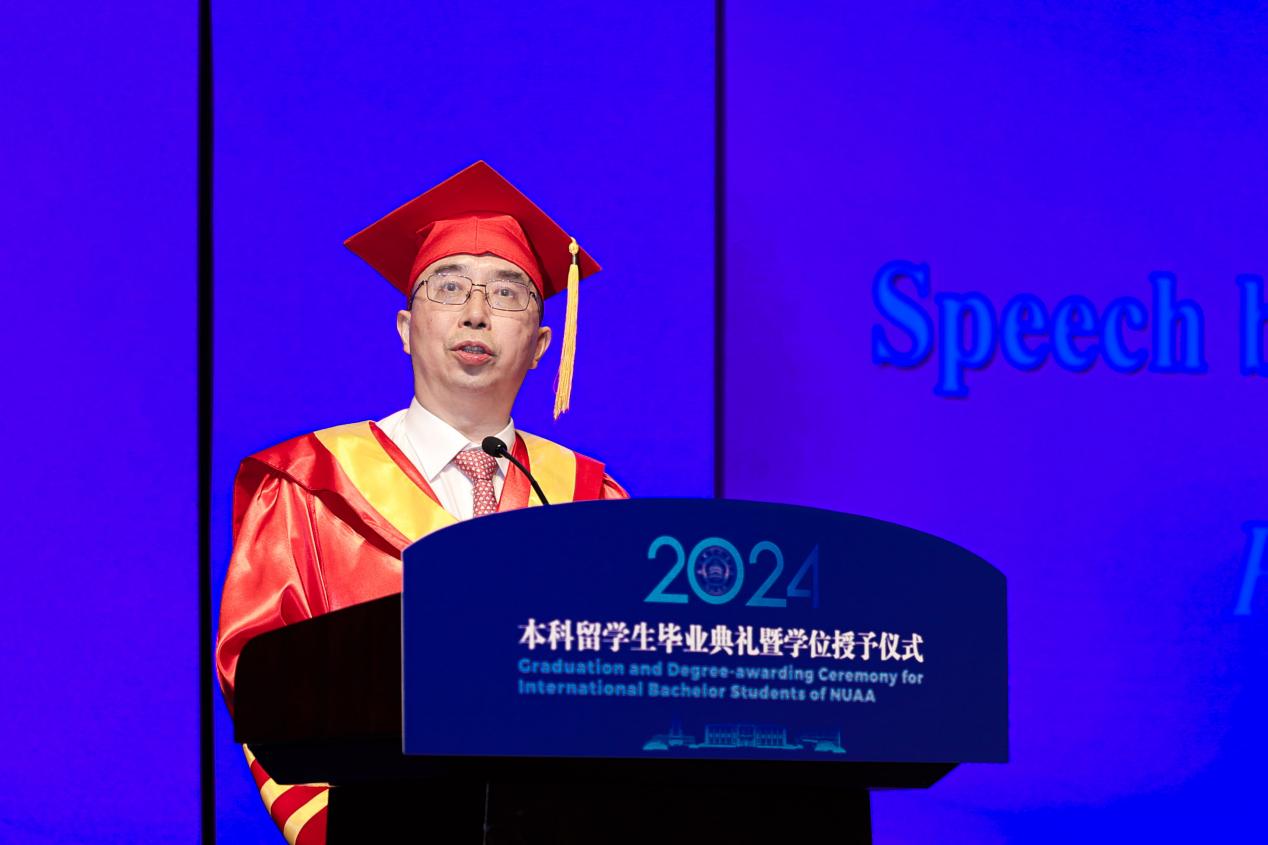 姜斌向2024届本科留学毕业生圆满完成学业表示热烈祝贺,向为他们付出辛勤汗水、给予无私关怀的南航教职员工和学生家长致以诚挚地感谢。他希望留学毕业生们在未来人生道路上志存高远,秉承“智周万物,道济天下”的校训精神,结合自身在华在校期间的所学所得所悟,以扎实的学识、开放的态度、全球化的视野,做创新思维的推动者、国际合作的参与者、文化交流的传播者,为国家进步、社会发展和人类命运共同体繁荣作出自己的贡献,在将小我融入大我中实现人生追求和自我价值。他祝福全体毕业留学生一路顺风、前程似锦,期待他们常回中国、常回母校看看,一起共叙情谊、共谋发展。