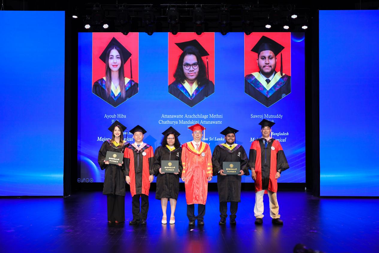 毕业典礼后进行学位授予仪式。姜斌、刘长江、国际教育学院原院长金泉元共同为2024届本科留学毕业生正冠拨苏并颁发毕业证书。