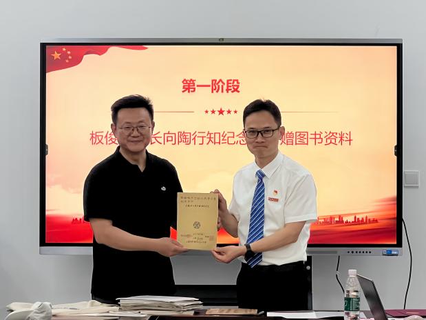 艺术学院院长板俊荣向陶行知纪念馆捐赠图书资料。板俊荣一直致力于对陶行知的研究,此次捐赠的这些图书资料,都是来自他多年的积累,非常珍贵,具有重要的收藏和研究价值。何文秋为板俊荣颁发了图书捐赠证书。