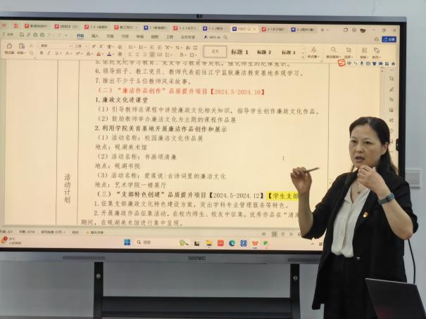 江苏省样板支部、音乐系教工党支部书记汪晓露,围绕发挥党支部工作特点和专业优势,促进党建与业务工作有机融合,加强党支部的标准化、内涵化、特色化建设等方面做了支部建设经验汇报。各支部还结合自身特色,围绕开展好“音诗书画,绘影演展,多元载体建强“艺”廉阵地,涵养“艺”院清风”重点党内主题教育项目,进行了充分的研讨。