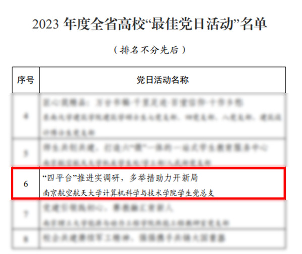 近日,江苏省委教育工委公布了2023年度全省高校“最佳党日活动”评选结果,计算机学院学生党总支“‘四平台’推进实调研,多举措助力开新局”主题党日活动荣获江苏省高校“最佳党日活动”。