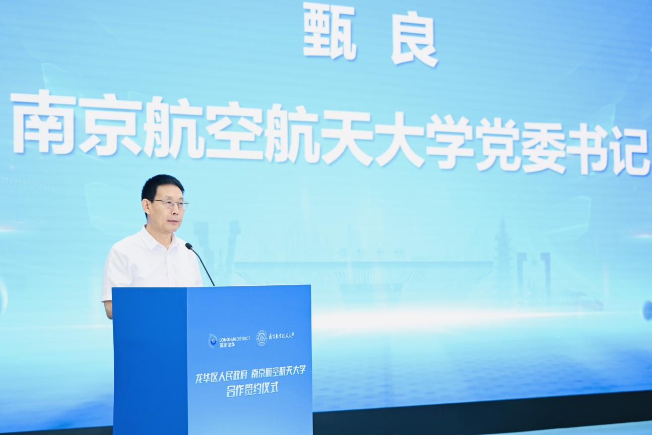 甄良代表学校向龙华区委区政府、深圳科技局和深圳空管站长期以来对南航事业发展的关心支持和指导帮助表示衷心感谢。他指出,校地共建南航-深圳低空智联产业科技创新中心和南航深圳研究院是落实习近平总书记重要讲话精神的具体举措,是赋能因地制宜发展新质生产力的实际行动,也是双方深化产学研融合发展的重要成果。他强调,近年来南航坚持服务粤港澳大湾区等国家重大战略,扎实推动科技创新与产业创新深化融合,在低空经济等领域取得了一系列标志性创新成果。龙华区地理位置优、产业基础实,产业发展与南航的学科专业布局、科研特色领域高度契合。希望校地双方聚焦龙华区的科技产业发展需求,进一步加强低空经济领域人才协同培养、科技协同攻关和成果协同转化,携手打造低空经济科技创新和产业发展高地,为加快发展新质生产力、扎实推进新型工业化作出新的更大贡献。